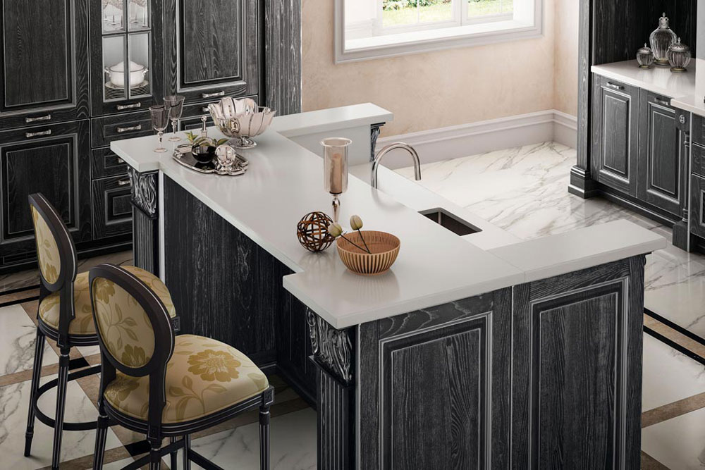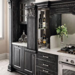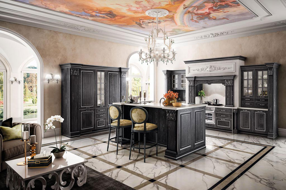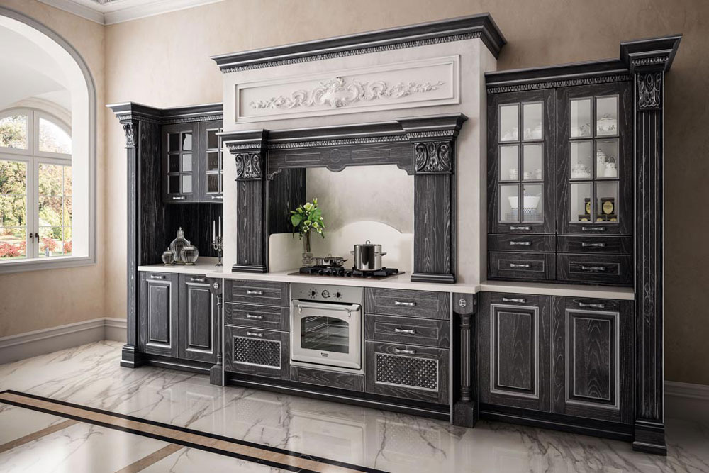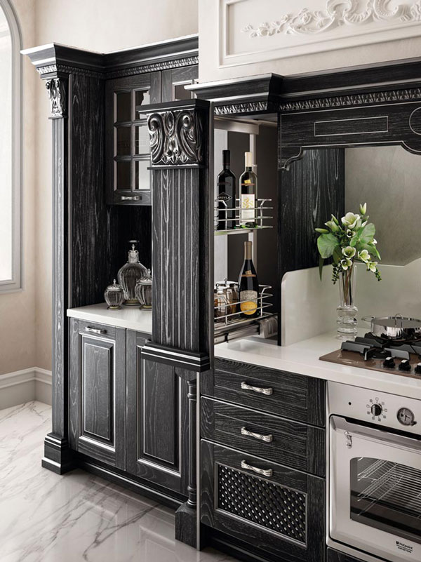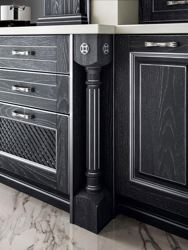Fregi, capitelli e decori sono inseriti in un ricco e avvolgente contesto architettonico creato per vivere un’esperienza che può rinnovarsi quotidianamente. Una composizione concepita su più livelli di utilizzo. La finitura antracite con effetto vintage argento dona atmosfere nobili che non rinunciano però ad elementi contemporanei, come la penisola e gli ampi cestoni della base. L’animo glamour è enfatizzato da soluzioni di sapienza artigiana, capaci di trasmettere sensazioni dal gusto prezioso.