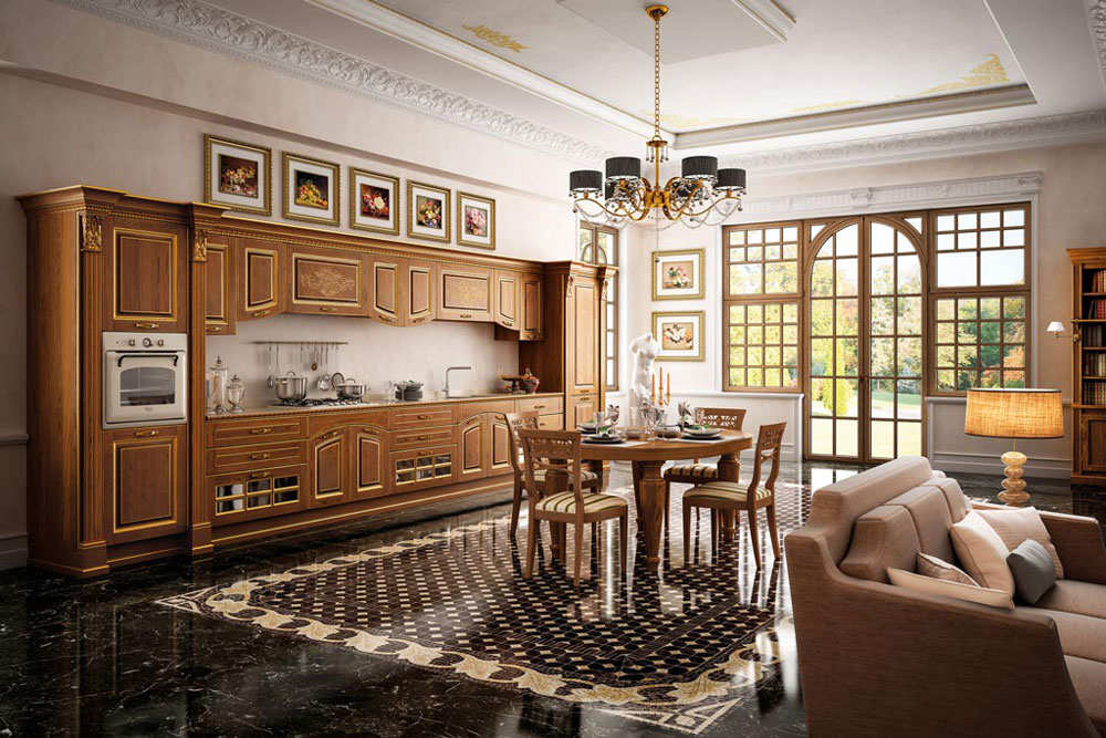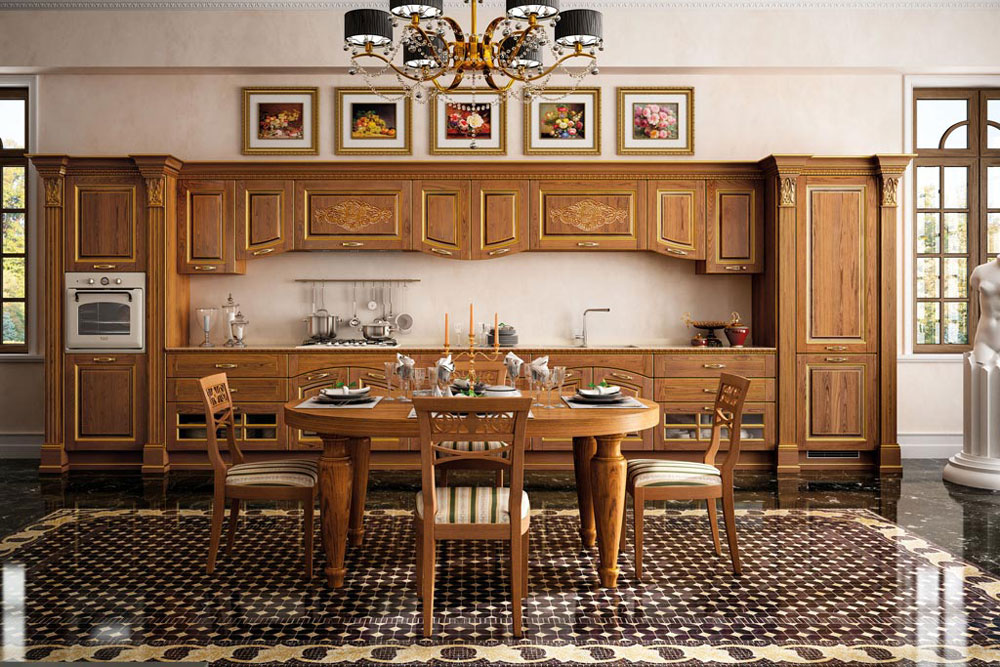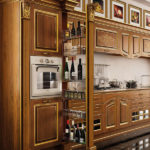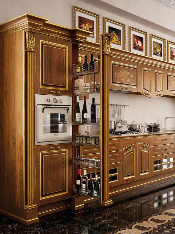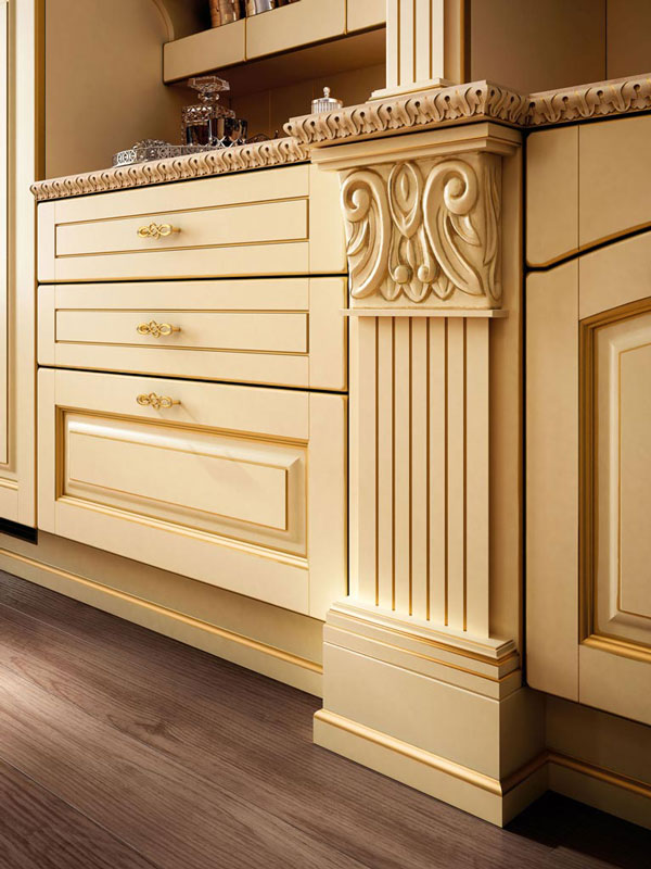 Il legno è il protagonista della collezione, il vero sovrano della cucina: le sue sfumature, l’allure che lo caratterizza, si esalta e si arricchisce con le lavorazioni filo oro. Gli intagli e i decori creano un gioco di volumi e profondità che avvicinano la linearità della composizione ad una creazione plasmata con cura e attenzione. I doppi pensili e le basi attorno al piano di lavoro, rafforzano la solidità dell’impianto stilistico, per scenari da vivere, tra villa signorile e dimora fuori porta.