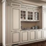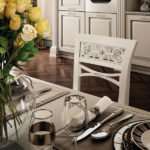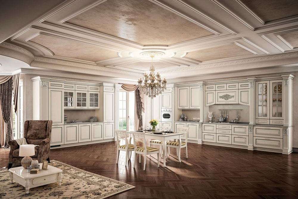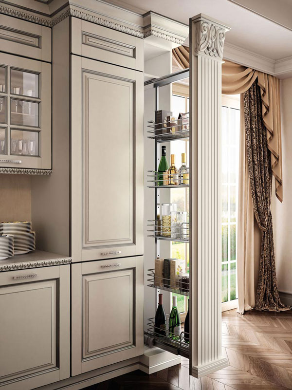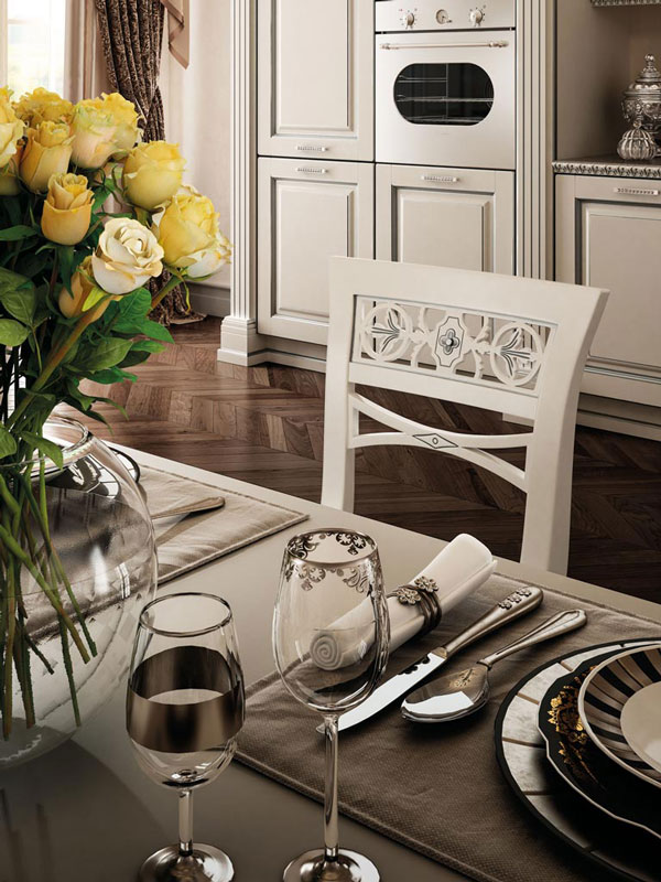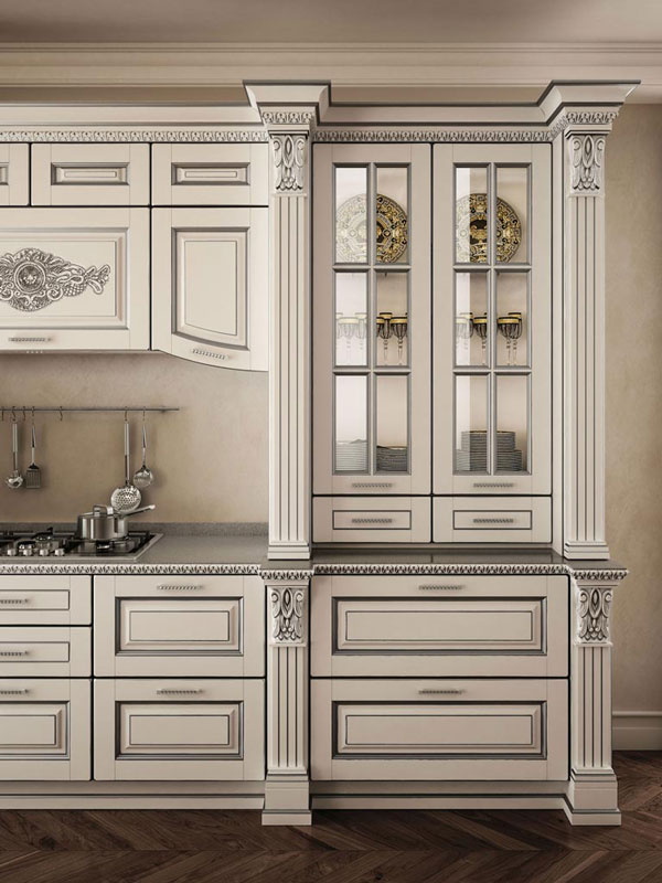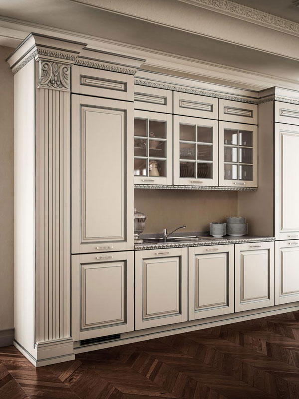 Grandi spazi e decoro classico: una proposta ideale per ambientazioni ampie e ricercate, con dettagli lussuosi che si lasciano apprezzare. Il colore bianco è esaltato dagli influssi argento, in una ricerca inesausta del rigore delle forme. Il blocco colonne si prolunga per contenere una parte della zona di lavoro, sormontata da cornici nei sottopensili ed estese vetrine ad inglesina. Perfezione e design curato nei suoi singoli elementi, tributo intrigante alla tradizione antica che rivive in tutto il suo splendore.