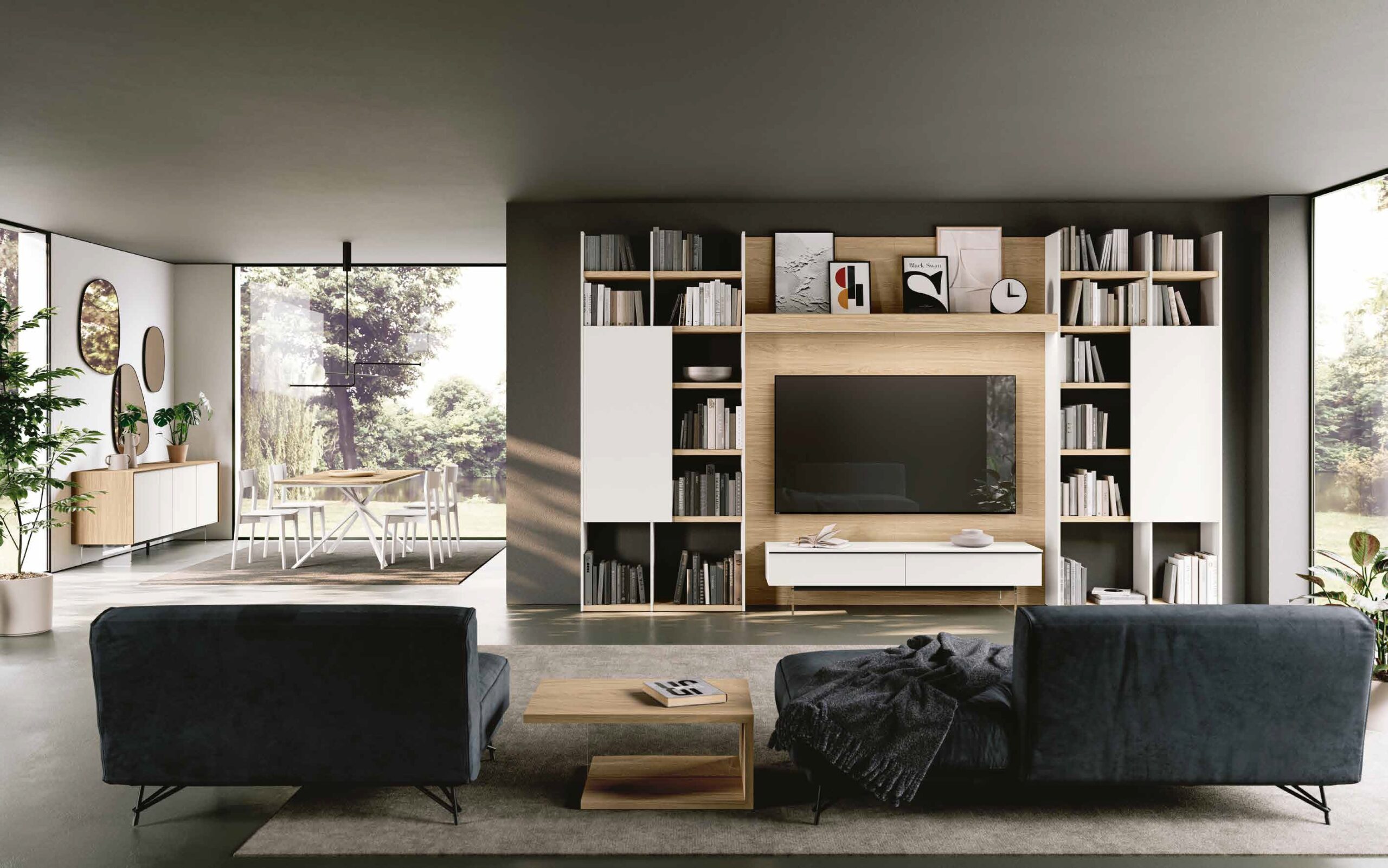 La parete Mito a spalla è la scelta ideale per chi desidera un ambiente living accogliente e strutturato. È un arredo “senza tempo” che non si limita a decorare, ma definisce lo spazio, offrendo una soluzione d’arredo completa che valorizza ogni centimetro della tua casa.