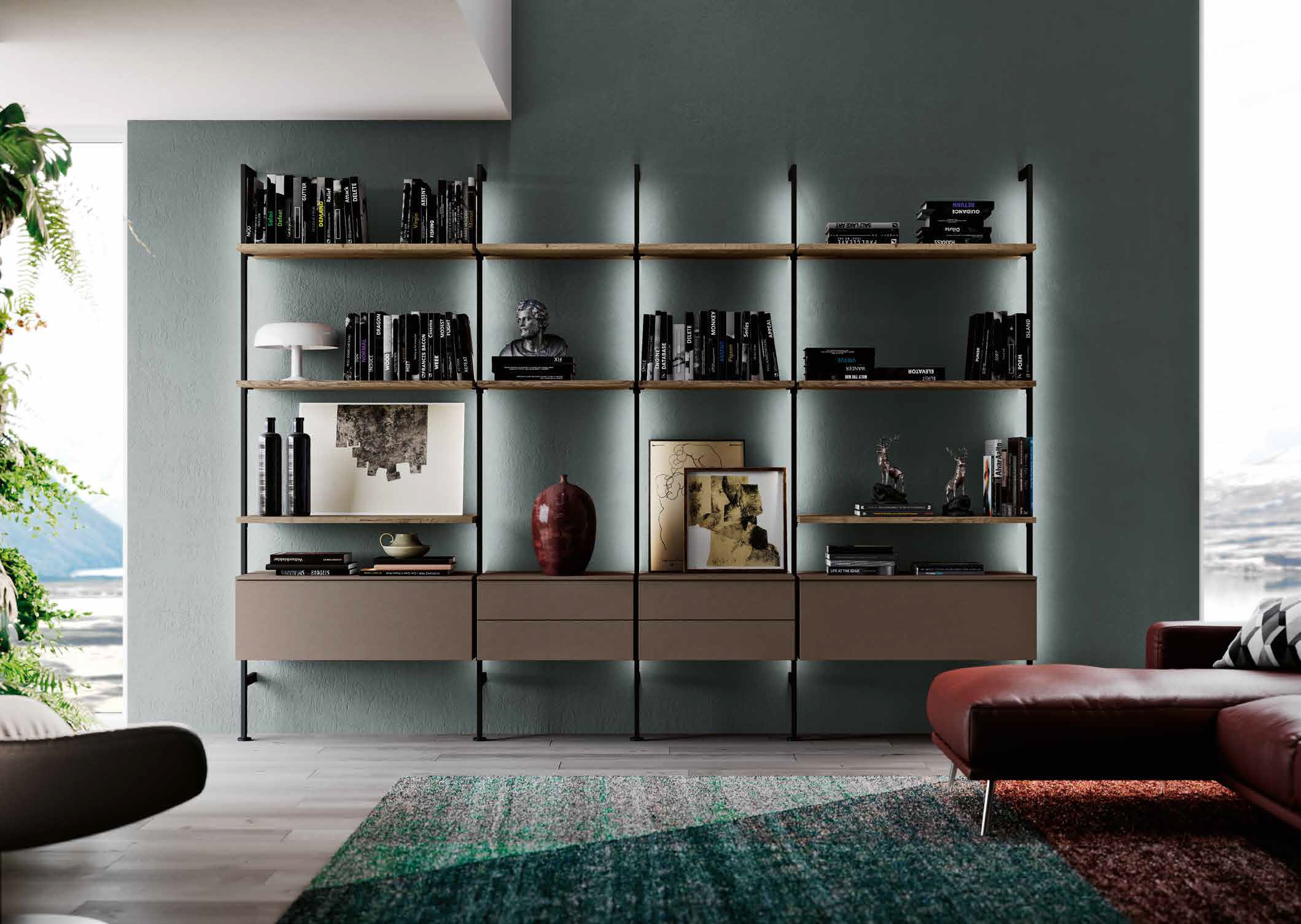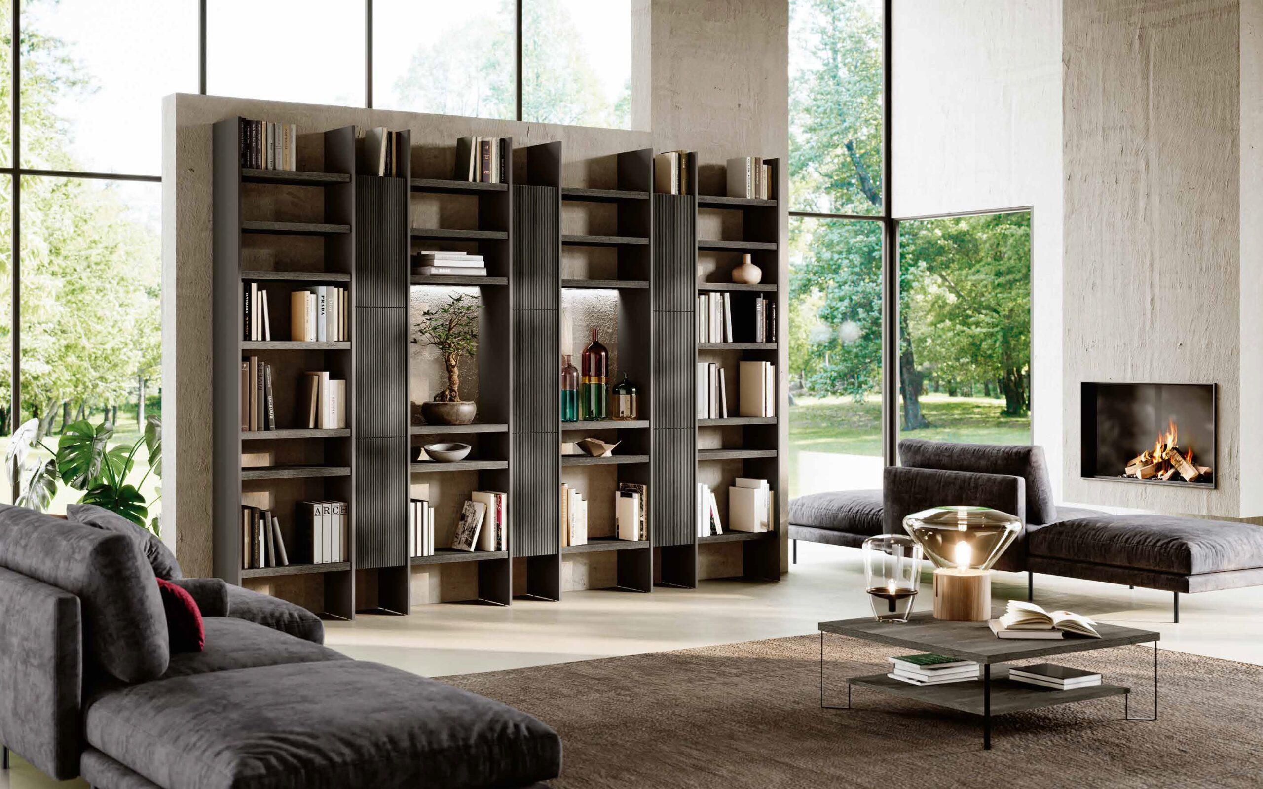 La linea Mito a spalla rappresenta la sintesi perfetta tra la solidità della libreria tradizionale e il design contemporaneo. Grazie alla sua struttura a montanti verticali, questa soluzione arreda l’intera parete con un carattere deciso, trasformando il soggiorno in una vera e propria biblioteca domestica dal sapore moderno.