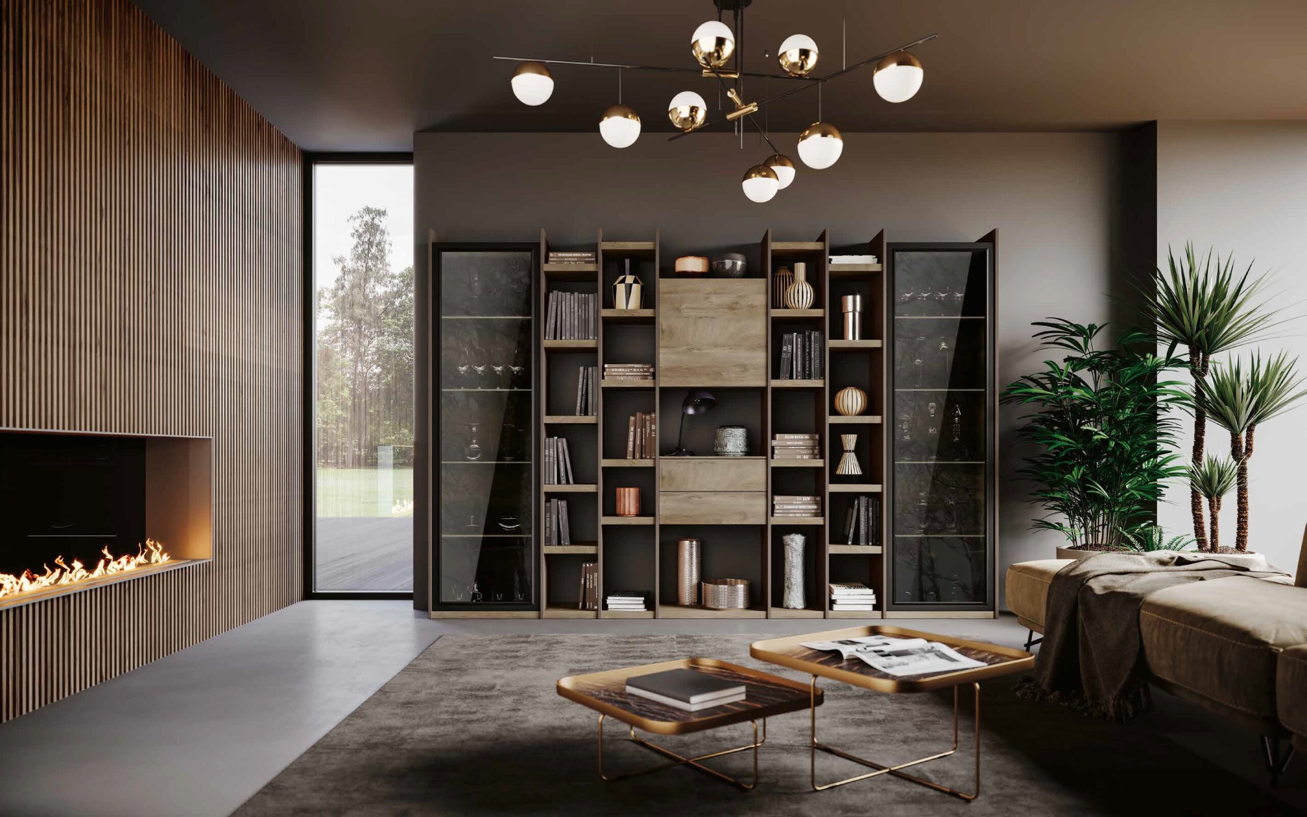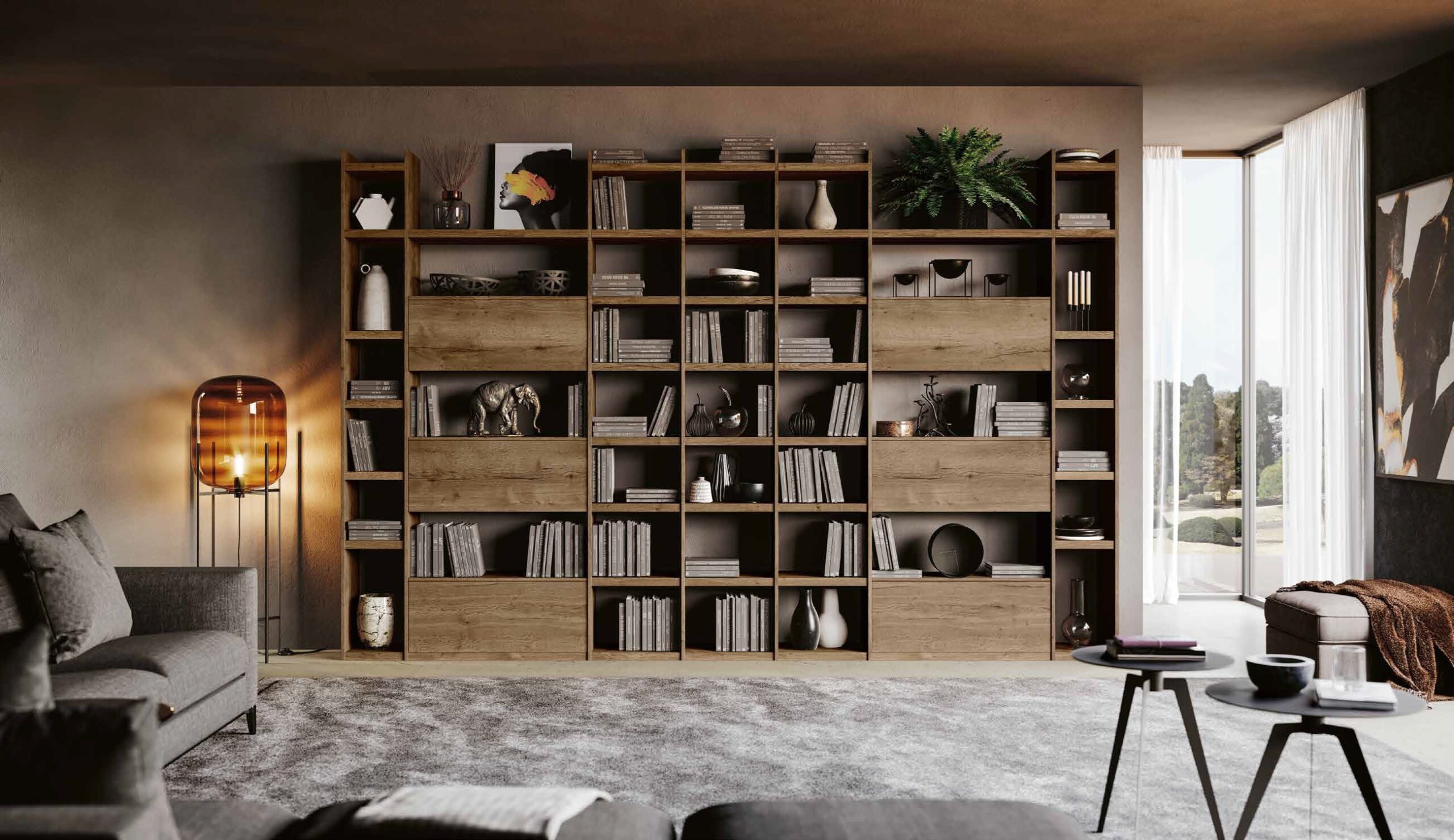 Gioco di Volumi: La linearità dei ripiani può essere interrotta da basi con cassettoni, vani porta-TV integrati o ante a contrasto, creando un dinamismo visivo che alterna sapientemente esposizione a giorno e contenimento chiuso.