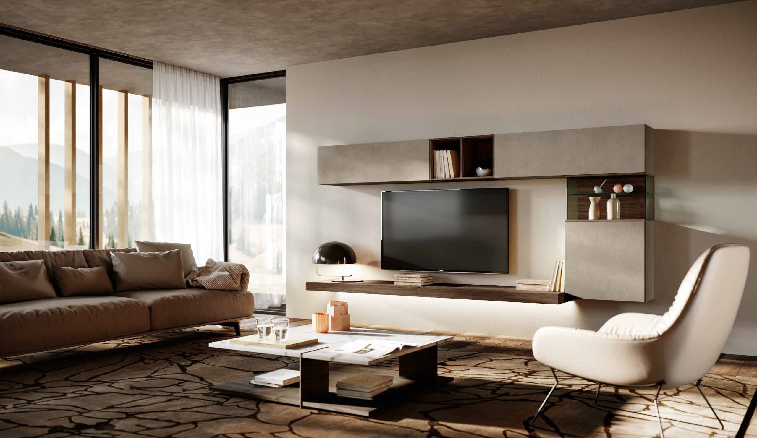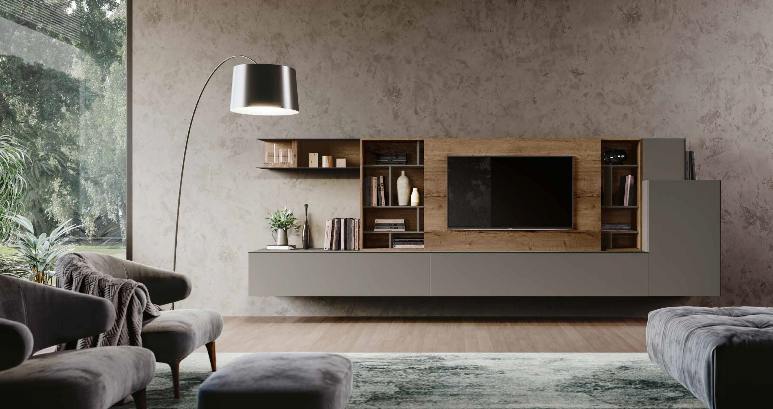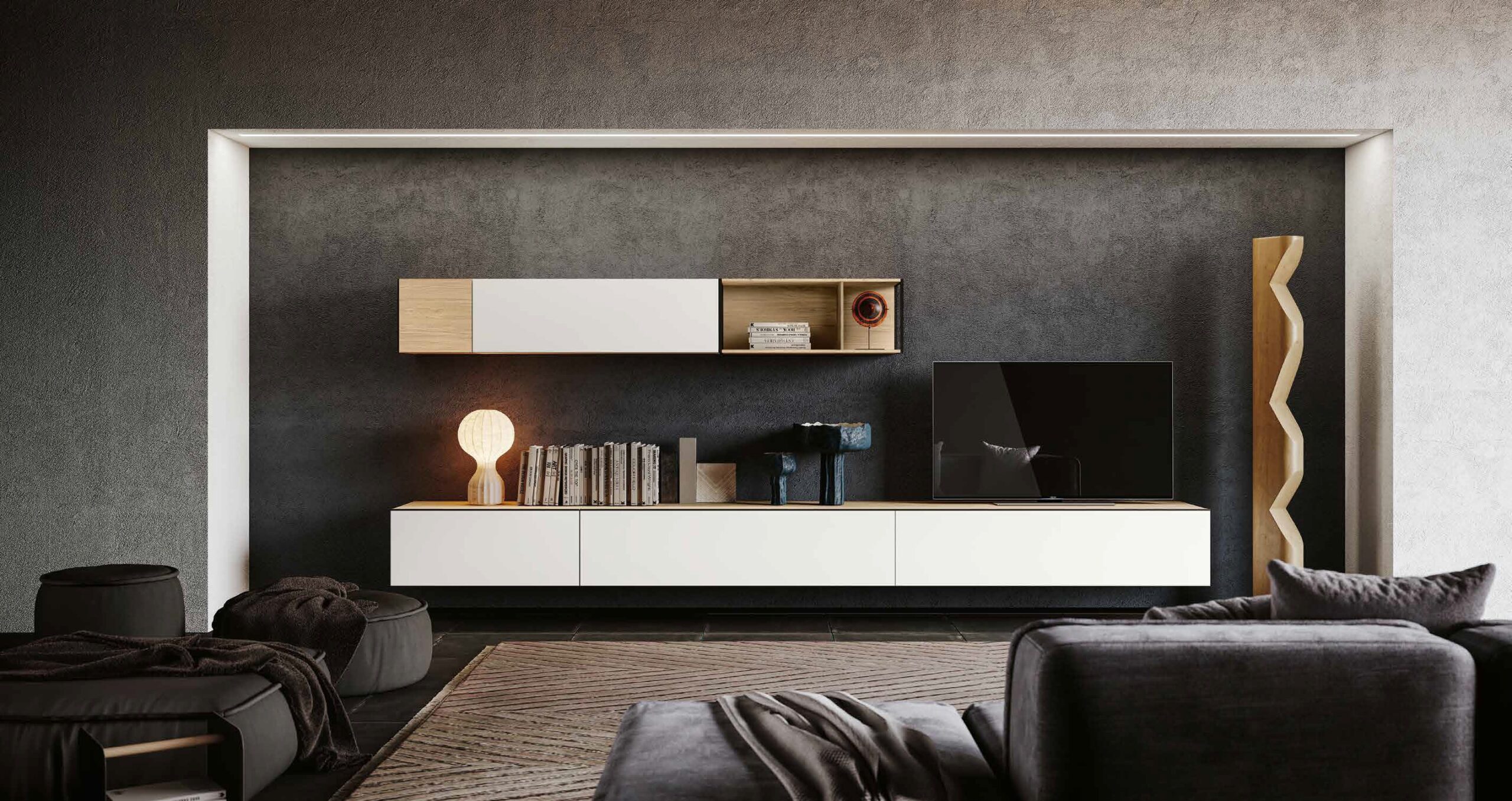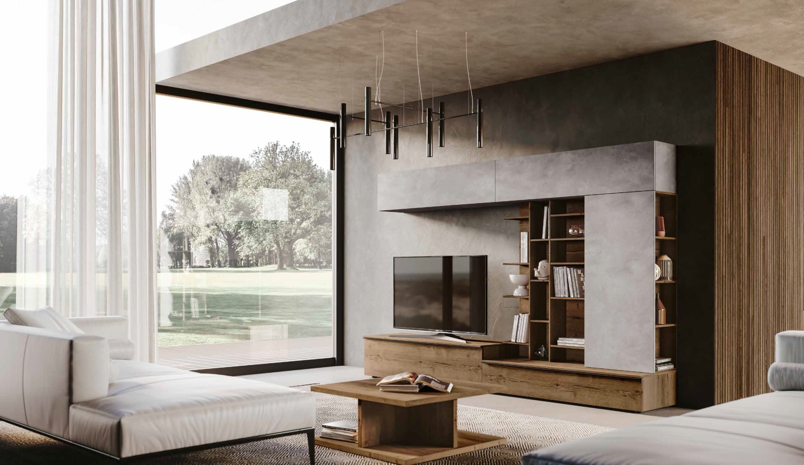 La parete Mito a spalla è la scelta ideale per chi desidera un ambiente living accogliente e strutturato. È un arredo "senza tempo" che non si limita a decorare, ma definisce lo spazio, offrendo una soluzione d'arredo completa che valorizza ogni centimetro della tua casa.