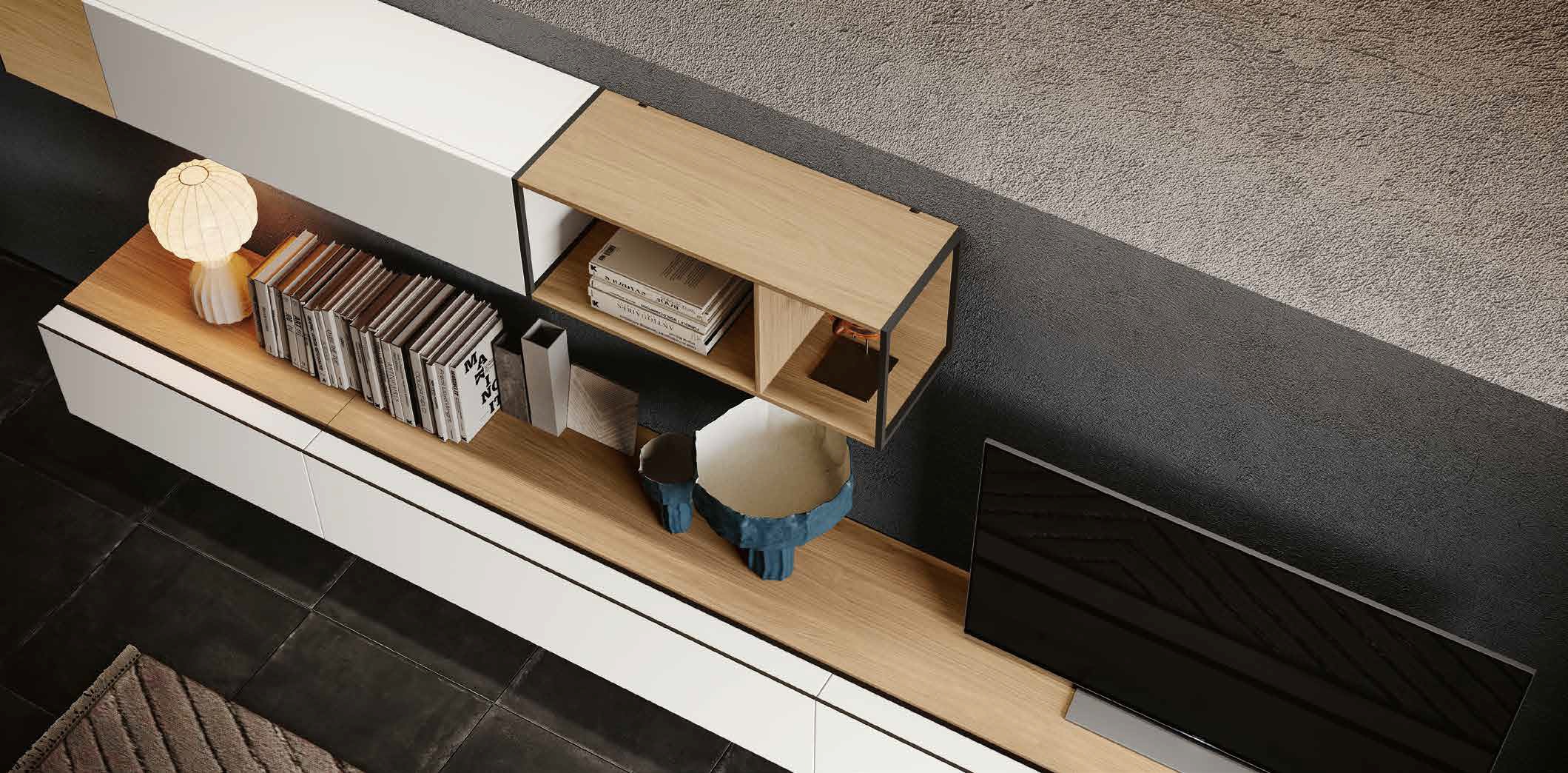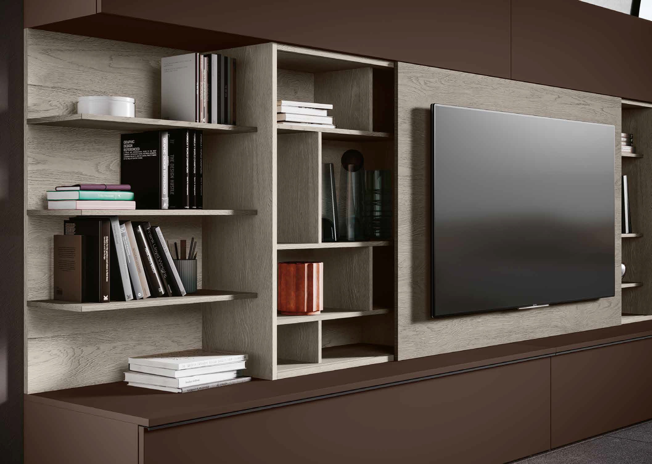 Integrazione Multimediale: Progettata per il living moderno, include soluzioni per il passaggio dei cavi e vani dedicati, mantenendo l'estetica pulita e ordinata.