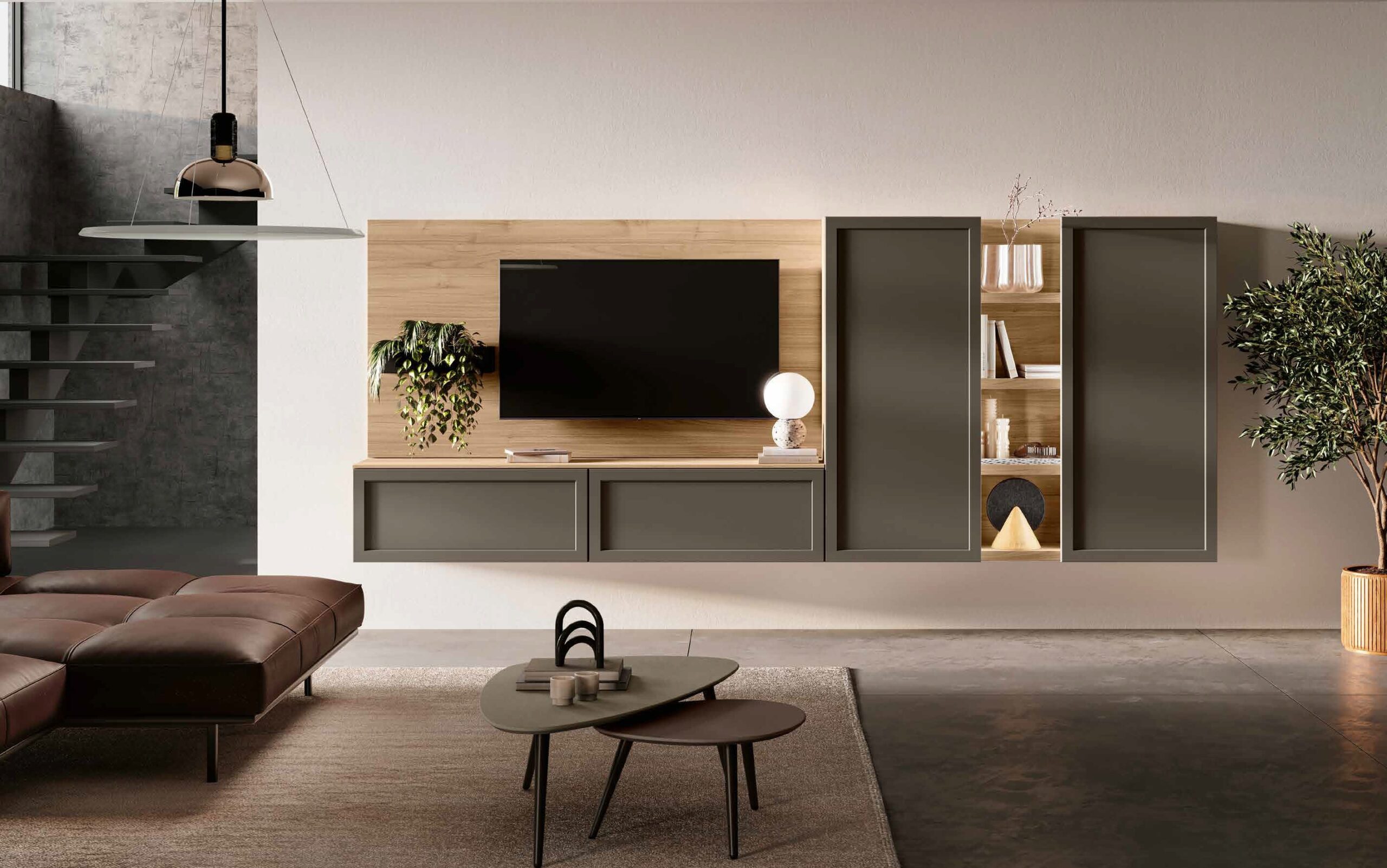 Finiture Materiche e Naturali: Disponibile in una vasta gamma di essenze legno calde e venate, accostate a tonalità neutre o materiche (come l'effetto cemento o pietra), per integrarsi armoniosamente in contesti sia industrial che minimalisti.