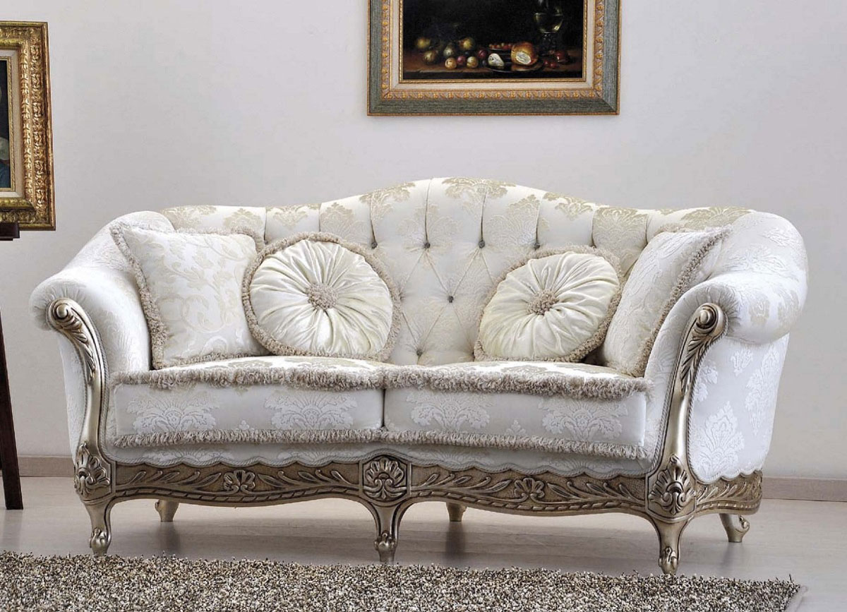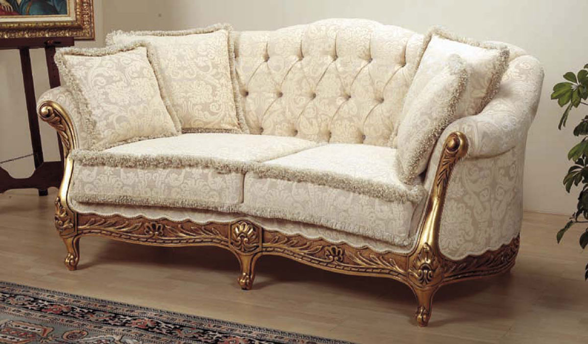 Un salotto classico con linee leggere e particolari; Cuciture in oro o argento sui tessuti.