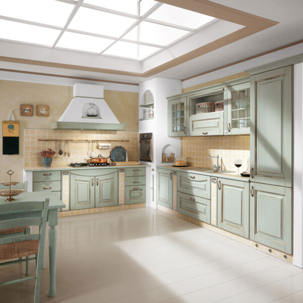 Il legno è il protagonista della collezione, il vero sovrano della cucina: le sue sfumature, l’allure che lo caratterizza, si esalta e si arricchisce con le lavorazioni filo oro. Gli intagli e i decori creano un gioco di volumi e profondità che avvicinano la linearità della composizione ad una creazione plasmata con cura e attenzione. I doppi pensili e le basi attorno al piano di lavoro, rafforzano la solidità dell’impianto stilistico, per scenari da vivere, tra villa signorile e dimora fuori porta.